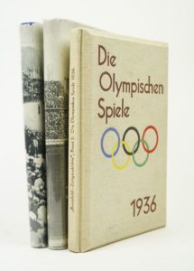Olympia 1936 - Die Olymischen Spiele 1936 in Berlin und Garmish-partenkirchen. Cigaretten-Bilderdienst ALTONA, 1936. 2 volumes. 23,5 par 30,5 cm. (2)-128 pages plus un grand plan en couleurs dépliant ; (2)-168 pages. Pleine percaline bleue titrée d'éditeur, avec jaquettes illustrée rempliées. Très légers défauts aux jaquettes, parfait état sinon de la reliure et de l'intérieur du livre. Très nombreuses reproductions photographiques (N et B et couleurs) de l'ensemble des épreuves sportives, comme de la propagande nazie. Complet. Avec : HAYMANN (Ludwig) : Die Olympischen Spiele 1936. 100 raumbild-Aufnahnen de Heinrich HOFFMANN. Dresden, Raumbild-Verlag otto Schonstein Diessen, 1936. Un volume. 20 par 28,5 cm. 62 pages, plus 8 feuillets noirs avec des photos stéréoscopiques contrecollées dessus. Pleine toile beige d'éditeur, titrée et illustrée. L'intérieur des plats contienne une visionneuse pour vues stéréoscopiques, et trois séries de photos stéréo. Parfait état. 100 vues stéréoscopiques légendées au verso. 22 sont contrecollées sur les feuillets noirs, les 78 autres photos sont dans les rangements insérés dans le second plat. Complet. Une belle et rare illustration des Jeux Olympiques de 1936.