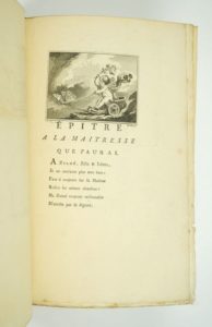 [DORAT (Claude-Joseph)] : Lettre d'Alcibiade à Glicère, bouquetière d'Athènes, suivie d'une lettre de Vénus à Pâris, et d'une épître à la maîtresse que j'aurai. (Genève), Paris, Sébastien Jorry, 1764. Un volume. 15 par 23 cm. 36 pages. Demi-chagrin citron, dos lisse, reliure moderne. Texte illustré d'une figure, 3 vignettes et 2 culs-de-lampe gravés par Alimet, Longueil et Lemire d'après Eisen. Exemplaire sur grand papier de Hollande Ce texte est aussi attribué à Masson de Pezay, attribution choisie par le relieur.