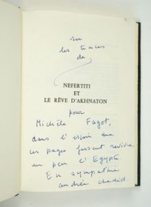CHEDID (Andrée) : Nefertiti et le rêve d'Akhnaton. Les mémoires d'un scribe. Paris, Flammarion, 1974. Un volume. 13 par 19,5 cm. 238 pages. Plein maroquin noir, dos lisse, encadrement intérieur, garde en soie jaune d'or, avec son étui bordé. Couvertures et dos conservés, tête dorée. Reliure signée FAGOT. Parfait état de la reliure comme du texte. Exemplaire de la 1ère édition (l'édition proprement originale est réduite à 15 exemplaires), enrichi d'un long envoi manuscrit d'Andrée CHEDID.