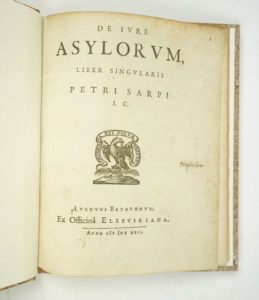 (Droit d'asile.). SARPI (Fra Paolo). De jure asylorum, liber singularis. Lugduni Batavorum, Ex …