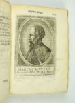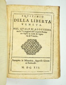 TOMASINI (Jacobi Philippi) : Iacobi Philippi Tomasini Patavini Illvstrivm Virorvm Elogia Iconibvs Exornata: Illvstriss. et reverendiss. D.D.; IO. Baptistae Agvcchiae Archiepiscopo Amasiensi, [et] Apostolico Nuncio Venetus pro Santiß; D. Urbano VIII. Patavii, Donatum Pasquarum & socium, 1630. Deux textes reliés en un volume. 14,5 par 19,5 cm. Frontispice gravé-(14)-373-(50) pages. Avec un frontispice gravé et 47 portraits gravés à pleine page (complet) et de nombreuses gravures sur bois d'armoiries et de médailles dans le texte. Bon état intérieur (une déchirure à une page, restaurée et sans manque) Cet ouvrage est la biographie des personnalités éminentes en lien avec Padoue. Relié avec [VENISE - WELSER (Marcus)] : Squitinio della liberta veneta. Nel quale si adducono anche le raggioni dell'Impero Romano sopra la Città & Signoria di Venetia. Stampato in Mirandola, Appresso Giovanni Benincasa, M. DC. XII [1612]. (2)-78 pages. Rousseurs. ÉDITION ORIGINALE de cet opuscule censuré par le Sénat de Venise, anciennement attribué à Alfonse de LA CUEVA, MARQUIS DE BEDMAR et cardinal. Plein vélin d'époque, titré à l'encre en haut du dos. Coupes légèrement usées, sinon très bon état. Deux textes rares rassemblés dans une reliure d'époque.