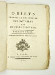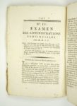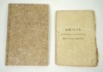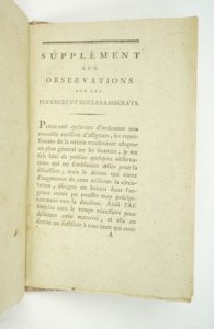 Réunion de deux brochures d'inspiration Physiocrate à l'aube et au début de la Révolution. Premier ouvrage : Objets proposés à l'Assemblée des notables par de zélés citoyens. Premier objet. Administrations provinciales. Paris, Imprimerie Polytype, (2)-69 pp. ;1787. Un fascicule. 14 par 19,5 cm. Broché, non rogné. Mouillure discrète sur quelques feuillets, rares rousseurs. Numéro 1er : Mémoire concernant l'utilité des états provinciaux. Par M. le Marquis de M[irabeau], pp. 3 à 23. N° II. Extrait du mémoire de M. Necker, présenté au Roi en 1778, sur l'établissement des administrations provinciales, pp. 24 à 33. N° III. Projet d'administrations municipales, des généralités, districts & arrondissemens ; par feu M. Le T...., pp. 34 à 45. N° IV. Examen des administrations provinciales. Par M. D.S.P., pp. 46 à 68. P. 69 : Observations sur les quatre ouvrages ci-dessus. Edition originale. Premier état. Conlon 87 : 803 ; Sudoc 055380050. Un second recueil fut publié la même année : Objets proposés [...]. Second objet. Impôts onéreux au Roi et à son peuple (Conlon 87 : 804). "Le Mémoire concernant l'utilité des états provinciaux reproduit la 1ère version de ce texte du marquis Victor de Mirabeau. L'extrait de Necker est tiré du Mémoire de Monsieur Necker, au Roi, sur l'établissement des administrations provinciales. Le Projet d'administrations municipales est de Guillaume François Le Trosne (et non d'un Le Tellier, cf. Barbier et Quérard), il est extrait du livre V, chap. VI-X de : De l'administration provinciale, et de la réforme de l'impôt..., cf. t. 1, p. 556-567 de l'éd. Basle ; Paris, 1788. L'Examen des administrations provinciales est le livre I (pp. 23-49) de De l'ordre des administrations provinciales déterminé par les loix physiques. Avec un examen du Compte rendu [de Necker] au mois de mars 1781, publié en 1782 par Guérineau de Saint-Péravi (et non, cf. Barbier, par Guignard de Saint Priest), redonné dans la même impression en 1785 sous le nouveau titre : Examen impartial du systême de M. Necker sur les administrations provinciales, où l'on discute les inconvéniens de leur constitution, de leur formation, et de leur gouvernement et régime ; avec un Essai sur le revenu public et l'impôt, et sur l'état actuel des finances du Royaume. Par M***. " (Sudoc). 2ème ouvrage : 1) Observations sur les finances, et particulièrement sur les assignats. [Paris], Desenne, 1791, 38 pp. ; (suivi de). -2) Supplément aux observations sur les finances et sur les assignats. [Paris], Desenne, s.d. [1791], 32 pp. Soit 2 ouvrages en 1 volume. 13 par 20,5 cm. Cartonnage bradel moderne. Très bon état de l'ouvrage. Edition originale. Très rare. Un seul autre exemplaire localisé. Kress B.2167 et B.2168 ; Goldsmiths'-Kress n° 14941.49 ; le Worldcat n'en recense aucun autre exemplaire ; le CCFr. n'en localise aucun. Du Pont de Nemours, dans son journal hebdomadaire Correspondance patriotique entre les citoyens qui ont été membres de l'Assemblée nationale constituante (vol. II, n° VII, pp. 9 à 20), a donné un compte-rendu assez favorable à ces deux brochures : "Ces deux brochures, d'un homme très-instruit et qui écrit avec beaucoup de facilité, ne remplissent pas entièrement leur titre. Il y est parlé des assignats, mais, non pas plus particulièrement que des autres objets que l'auteur y passe en revue, dont les principaux sont l'organisation du ministère des finances, celle des comités de l'assemblée nationale, la balance à établir entre la recette et la dépense, une critique assez sévère des opérations de l'assemblée nationale constituante sur tous ces points." (1er paragraphe de l'article).