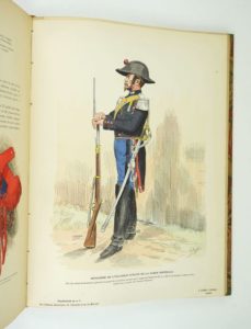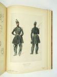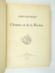 Album historique de l'armée et de la marine. [Sous la direction de M. Jules Rouffet]. Paris, J. Leroy, (1905-1906). Un volume. 27,5 par 38 cm. (10)-98-(1) pages + 7 pl. h.t. + 41 planches h.t. en couleurs (dont 2 sur double page). Demi-chagrin marron d'époque, dos 5 nerfs, pièce de titre rouge. Papier des coupes légèrement usé, sinon très bon état de l'ouvrage. Une petite déchirure sans manque page 5. Exemplaire numéroté (276). Tout ce qui a paru de cette belle revue militaire. Elle parut du 15 mai 1905 au n° 12 (15 avril 1906). Colas, Bibliographie générale du costume 70. Publié à l'occasion du 10e anniversaire de la fondation du Musée de l'Armée, sous la direction de J. Rouffet et avec la collaboration de MM. le capitaine de Baillehache, Bertrand, Bottet, Fouqueray, Margerand, Yvert, Benigni, Leroy, M. Toussaint, E. Detaille, B. Franck, Kolb, Raffet, etc.. Cette très belle publication est illustrée de 48 planches h.t., dont 41 en couleurs en phototypie et en zincographie coloriée et d'un grand nombre de gravures dans le texte, la plupart rehaussées de couleurs, qui en font un très bel ensemble rétrospectif sur le costume militaire français.