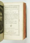 PALISSOT (PALISSOT de MONTENOY, Charles) : Mémoires pour servie l'histoire de notre littérature depuis François premier jusqu'à nos jours. Nouvelle édition. Genève, Paris, Moutard, 1775. 296 pages. Page de titre habilement restaurée. Ouvrage régulièrement réédité durant 50 ans. Relié avec LOS RIOS (Jean-François de) : Bibliographie instructive, ou Notice de quelques livres rares, singuliers & difficiles à trouver, avec des notes historiques, pour connoître & distinguer les différentes éditions, & leur valeur dans le commerce, par François de Los Rios, libraire à Lyon. Avignon, François Seguin, Lyon, chez l'auteur, 1777. Un volume. Portrait-XVI-207 pages. Le livre se poursuit avec 3 pages manuscrites, donnant quelques résultats de ventes tirés de la dispersion de la colossale bibliothèque du Duc de la Vallière (janvier 1784). Le livre donne 639 notices, plus 190 notices dans le supplément qui suit l'ouvrage. 11,5 par 19 cm. Plein veau d'époque, dos 5 nerfs, caissons ornés, pièce de titre havane. Quelques épidermures sur les plats, sans gravité.