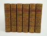 HESSELN (Robert de) : Dictionnaire universel de la France contenant la description géographique & historique des provinces, villes, bourgs & lieux remarquables du royaume ; l'état de la population actuelle, de son clergé, de ses troupes, de sa marine, de ses finances, de ses tribunaux, & des autres parties du gouvernement : ensemble l'abrégé de l'histoire de France, divisée sous les trois races de nos rois ; des détails circonstanciés sur les productions du sol, l'industrie & le commerce des habitans ; sur les dignités & les grandes charges de l'Etat ; sur les offices de la judicature & emplois militaires ; ainsi que sur ceux de toutes les autres branches de l'administration. Avec un grand nombre de tables qui rassemblent, sous un même coup d'oeil, les divers districts ou arrondissemens du gouvernement ecclésiastique, civil & militaire. Paris, Desaint, 1771. 6 volumes. 10,5 par 16,5 cm. XVI-664 ; (4)-680 ; 675 ; (4)-714 ; (4)-659 ; (4)-645-(2) pages. Plein veau de l'époque, dos 5 nerfs ornés, pièce de titre rouge. Petits défauts mineurs (une coiffe usée, quelques coins légèrement émoussés, trois petits trous de ver sur les reliures). Quelques rousseurs, traces discrètes d'humidité, intérieur convenable. Edition originale. Conlon 71 : 1021 ; INED 2270. Robert de Hesseln, ingénieur géographe et censeur royal, fut à l'origine d'un projet de cadastre qui ne vit jamais le jour. Il donne ici un remarquable aperçu excessivement détaillé, outre la partie géographique, de tout ce qui peut être considéré comme administratif. Importante source documentaire.