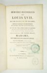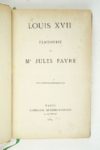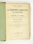 Réunion de quatre ouvrages sur Louis XVII. 1 - FAVRE (Jules) : Louis XVII. Plaidoirie. Paris, Librairie Internationale, 1884. Un volume. 11,5 par 18 cm. 371-(2) pages. Demi-veau fauve d'époque, dos 5 nerfs, pièce de titre rouge, couvertures conservées. Reliure en bon état, rousseurs éparses, couvertures conservées légèrement salies. On a inséré, entre les pp. 4 et 5, deux articles de journaux de 1898, montés sur onglets. 2e édition (E.O. : 1874). Parois, Essai de bibliographie sur Louis XVII, n° 392. Pour les héritiers de Naundorff "Cette édition présente un intérêt juridique, et forme un recueil de documents qui peuvent être cités en toute sécurité en raison de leur enregistrement au greffe de la cour d'Appel de Paris (février 1874) ". 2 - LAMBEAU (Lucien) : La question Louis XVII. Le cimetière de Sainte-Marguerite et la sépulture de Louis XVII. Historique - Disparition prochaine - 1624-1904. Ouvrage orné de 3 plans hors-texte. Paris, H. Daragon, 1905. Un volume. 14 par 22 cm. 238-(1) pages + 3 plans sur 2 feuillets dépliants (complet). Demi-percaline bordeaux à la bradel de l'époque, pièce de titre noire. Bon état. Edition originale. Parois 582. 3 - ECKARD (Jean) 1) Mémoires historiques sur Louis XVII, roi de France et de Navarre, ornés du portrait du jeune prince et de celui de son auguste soeur ; suivis de fragmens historiques recueillis au Temple par M. de Turgy, et de notes et pièces justificatives : dédiés et présentés à Son Altesse Royale, Madame, Duchesse d'Angoulême. Troisième édition. Paris, H. Nicolle, 1818, 2 portraits-(4)-XV-(1)-496 pp. + 1 f. d'errata ; (suivi de). -2) Une lettre sur l'éducation du Dauphin, attribuée à Louis XVI, est-elle authentique ? Et observations sur les recueils de lettres publiées en 1803 et 1817, sous le nom de ce prince. Par l'auteur des Mémoires historiques sur Louis XVII. Paris, H. Nicolle, 1819, 56 pp. ; Soit 2 ouvrages en 1 volume. 12 par 20 cm. Plein veau de l'époque, dos orné (mais décoloré), dentelle dorée encadrant les plats, coins usés. Ex-libris au crayon bleu et cachets d'appartenances anciennes. 1) 3e édition (E.O. : 1817). Parois, Essai de bibliographie sur Louis XVII 356. Ouvrage classique en faveur de la thèse de la mort au Temple de Louis XVII. 2) Le faux-titre porte : Lettres attribuées à Louis XVI. Edition originale. Tourneux 20832. "La lettre visée par la première partie du titre est celle que Louis XVI aurait adressée, le 11 mars 1791, à l'abbé d'Avaux, sous-précepteur du Dauphin, et dont l'original aurait été trouvé sur le cadavre du Duc de Brissac, massacré à Versailles, en septembre 1792 !" (Tourneux). Eckard démontre que cette lettre est dénuée d'authenticité. La critique moderne confirme ce jugement. 4 - BOISSY D'ANGLAS (François-Antoine) : La question Louis XVII au Parlement. Rapport au Sénat fait au nom de la 3e commission des pétitions (mars 1910) chargée d'examiner la pétition n° 44 de M. Charles-Louis de Bourbon [Naundorff]. Deuxième édition augmentée de pièces inédites et d'illustrations. Introduction. Dépositions de MM. Ernest Daudet, Foulon de Vaulx (Henri Provins), Otto Friedrichs. -Pièces justificatives. Conclusion. Paris, H. Daragon, 1911. Un volume. 16,5 par 24 cm. 310-(1) pages. Demi-basane de l'époque, dos 4 nerfs, couverture conservée. Dos insolé, frottements aux coupes, taches claires sur une vingtaine de ff.. 3 fac-similés in-texte (dont un sur double page) et 3 planches in-texte. On a collé un article de journal, Guillaume II et Louis XVII, à la fin du volume. Parois 113.