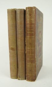 VERNE (Jules) - trois cartonnages violets. Une ville flottante et aventures de 3 Russes et de 3 Anglais. Cartonnage dit A la bannière (bordeaux sur fond prune) 1875. Petite coupure à une charnière, gorge légèrement déboitée, dos passé, charnière intérieure du 1er plat en partie fendue. Michel STROGOFF, de Moscou à Irkoutst. Hetzel, cartonnage aux deux éléphants, violet. Usure du second plat, dos passé, une fente à la charnière intérieure du 1er plat. Gorge régulière sauf le 1er cahier. Vingt mille lieues sous les mers. Hetzel, cartonnage aux deux éléphants, violet. Fentes sur les charnières, dos passé, multiples petits défauts. Les trois cartonnages dans une couleur rare, mais dans un état médiocre