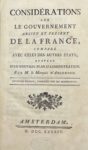 ARGENSON (René-Louis Le Voyer d') — Considérations sur le gouvernement ancien et présent de la France, comparé avec celui des autres États, suivies d'un nouveau plan d'administration. Amsterdam, s.n.,