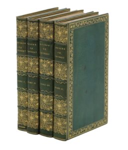 Paris, Delalain, 1769. 4 volumes in-12, maroquin vert émeraude à long grain, bordure de pampres dorés, dos orné de petits fers dorés sur fond criblé, coupes décorées, dentelle intérieure, tranches dorées (Bozerian).Édition originale de la traduction française de Pierre Jaubert, curé de la paroisse de Cestas en Guyenne. Membre de l'Académie des belles-lettres de Bordeaux, celui-ci a collaboré à l'Encyclopédie de Diderot et d'Alembert.