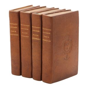 4 volumes in-12, maroquin lavallière, large dentelle de rinceaux et petits fers rocaille et armoiries au centre estampées à froid, dos lisse orné à froid, titre doré, filet doré sur les coupes, doublure de maroquin bleu ornée d'une dentelle dorée, gardes de soie rose, tranches dorées (Reliure de l'époque).Rarissime bréviaire imprimé à 60 exemplaires seulement aux frais du duc de Penthièvre.
