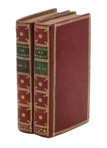 La Haye, Adrian Moetjens, 1700. 2 volumes petit in-12, maroquin rouge, triple filet doré, dos lisse orné, dentelle intérieure, doublure et gardes de papier d'Augsbourg, tranches dorées (Reliure du XVIIIe siècle).Édition recherchée des œuvres de Marot.