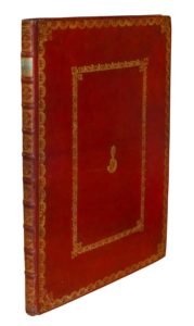 Paris, Huquier, s.d. [1748]. In-folio, maroquin rouge, double encadrement de frises formées par répétition d'un motif doré, fleurons aux angles internes, grand fleuron central, dos orné, tranches dorées, boîte moderne en demi-maroquin rouge (Reliure de l'époque).Le plus spectaculaire des livres d’ornementation du xviiie siècle.