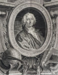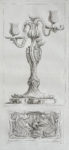 Juste-Aurèle Meissonnier (1695-1750), le plus grand artiste rococo. Né à Turin d’une famille d’orfèvres d’origine provençale, il créa des motifs dans tous les registres des arts décoratifs, des boiseries aux chandeliers. Arrivé à Paris dès 1715, il devint en 1725 orfèvre du Roy et travailla à la manufacture des Gobelins. Succédant en 1726 à Jean-Baptiste II Bérain, fils du grand Jean Bérain, en tant que dessinateur de la chambre et cabinet du Roy, il acquit une réputation internationale et travailla pour le comte de Maurepas, M. Brethous, la princesse Sartorinski de Pologne, M. le comte Bielenski, grand maréchal de la couronne de Pologne, le baron et la baronne de Bezenval et le duc de Mortemart. Le nombre de ses réalisations qui lui survécurent étant restreint, son œuvre reste aujourd’hui connue par la gravure.