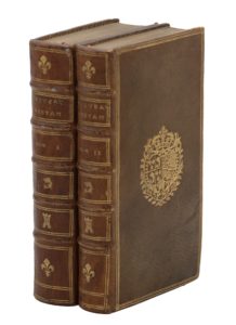 Paris, veuve Mazières & J.B. Garnier, 1738. 2 volumes in-12, maroquin olive, triple filet doré, armoiries au centre, dos orné de pièces d'armes alternées, dentelle intérieure, doublure et gardes en papier doré, tranches dorées sur marbrure, étui postérieur (Reliure de l'époque).Nouvelle édition, revue et corrigée, de la traduction française publiée par l'oratorien Denis Amelote entre 1666 et 1670.