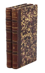 Genève et Paris, Veuve Duchêne, 1777. 2 volumes in-12, demi-chagrin brun avec coins, dos orné de filets dorés, tranches mouchetées (Reliure russe du XIXe siècle).Édition originale rare de ce roman singulier, ornée de 15 figures hors texte d’André Dutertre gravées par Berthet – excepté la première, qui est signée Bacquoy.