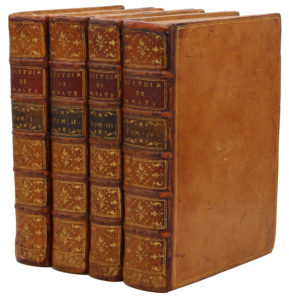 Paris, Rollin, Quillau, Desaint, 1726. 4 volumes in-4, veau fauve, triple filet doré, dos orné, dentelle intérieure, tranches dorées (Reliure de l'époque).Édition originale de cette somme sur l’ordre de Malte.