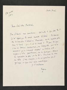 COCTEAU Jean [Maisons-Laffitte, 1889 - Milly-la-Forêt, 1963], poète et écrivain français. Lettre autographe signée, adressée à un ami Frédéric. Santo Sospir, 28 juillet 1952 ; 1 page in-4°. Il demande des nouvelles de son ami et de son film. « Ton silence me consterne. Où es-tu ? Que fais-tu ? j'ai appris que tu avais monté le film. Tu aurais dû le demander d'abord à Francine. Ne le montes plus sans le faire. Y a-t-il du neuf ? Figure toi que c'est un homme sandwich, rue Lafayette, qui m'a annoncé qu'on donnait Orphée au studio 28. À force d'être posthume, on se fatigue ».