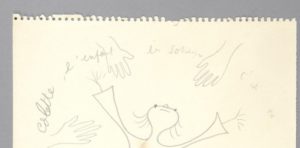 COCTEAU Jean [Maisons-Laffitte, 1889 - Milly-la-Forêt, 1963], poète et écrivain français. Dessin à la mine de plomb et trace de brun sur la chemise de l'enfant titré dans la composition « Ma chère Colette, l'enfant, les sortilèges, c'est toi. » (représentant une esquisse pour la couverture du disque l'Enfant et les sortilèges texte de Colette - musique de Ravel). [Exécuté en 1953] ; 30 x 22,6 cm. cachet de l'atelier en bas à droite. Certificat d'Annie Guédras joint. On joint le tract édité par Michel de Bry sur Vélin d'Arches (32 x 23,5 cm) représentant le dessin définitif. Avec les précieuses indication de Madame Annie Guédras.