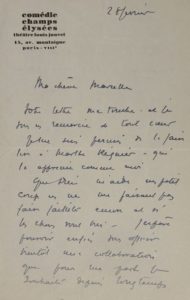 JOUVET Louis [Crozon, 1887 - Paris, 1951], homme de théâtre français. Lettre autographe signée, sur papier à en-tête de la Comédie Champs Elysées, théâtre de Louis Jouvet. Adréssée à Marcelle Geniat ; 28 février. 2 pages in-8° « Ma chère Marcelle, votre lettre me touche et je vous en remercie de tout coeur. Je me suis permis de la faire lire à Marthe Régnier qui l'a appréciée comme moi [...] J'espère pouvoir enfin vous offrir bientôt une collaboration que pour ma part je souhaite depuis longtemps ».
