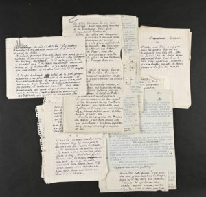 PAGNOL Marcel [Aubagne, 1895 - Paris, 1974], écrivain et cinéaste français. [Le Temps des Secrets]. Manuscrits autographes [1959-1960] ; environ 60 feuillets de formats divers, avec quelques passages dactylographiés. Fragments du Temps des secrets, 3e tome des Souvenirs d'enfance, paru en 1960 après Le Château de ma mère. Où l'on retrouve notamment l'histoire de ses grands-parents, avec quelques passages dactylographiés insérés au manuscrit, des scènes concernant Isabelle, l'amoureuse du narrateur, son ami Lili, son frère Paul, la découverte du lycée, etc. Avec quelques variantes inédites et des passages biffés, ainsi qu'un texte de présentation : « Ce livre devait s'intituler 'Les belles amours'. Au dernier moment, l'auteur a changé de titre. D'abord, parce qu'il existe déjà un assez grand nombre d'ouvrages qui le portent : des chansons, des poèmes, des romans. Et d'autre part, il lui a semblé que 'Le Temps des Secrets' convenait mieux à ces historiettes d'un petit garçon qui commence à ne plus tout dire à la maison. […] Et tout naturellement, le premier grand secret, c'est son amour pour Isabelle. Il trahira moralement sa famille, il oublie son ami Lili… Puis, demi-pensionnaire au lycée, il s'installera dans un monde nouveau ».