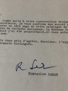 SAGAN Françoise (Françoise Quoirez, dite) [Cajarc, 1935 - Honfleur, 2004], écrivain français. Lettre dactylographiée signée, adressée à M. Didier Heidet. Paris, 24 mars 1983 ; 1 page in-folio. « Comme suite à votre conversation téléphonique avec ma secrétaire, je vous confirme mon accord pour faire figurer en 1ère page de votre catalogue de vente aux enchères de voitures anciennes, la Grahame Paige de 1939, dont j'ai été propriétaire, et vous autorise à citer mon nom ».