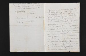 SAND George (Aurore Dupin, baronne Dudevant, dite) [Paris, 1804 - Nohant, 1876], romancière française. Lettre autographe signée. Nohant, La Châtre, Indre, 22 janvier 1866 ; 3 pages 1⁄2 in-8°. Haut de la 4e page légèrement rognée. Elle se souvient du « Petit travail promis » à Louis Ulbach, « Je m'y prépare en vous lisant ; mais je me demande pourquoi cet article ne serait pas fait pour vous qui décrivez aussi heureusement au point de vue littéraire et artiste, qu'au point de vue savant et pratique. Tout ce que je pourrai faire pour ne pas sortir de la question sera de vous résumer et vous permettrez de croire de qui je tiens ma science sur cette matière. Je vais étudier vos fougères dès que j'aurais un peu ma tête, bien affaiblie en ce moment [...] Puisque vous êtes du Berry, vous aurez peut-être l'occasion d'y revenir et je serais bien heureuse. ».
