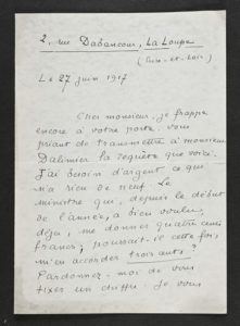 TAILHADE Laurent [Tarbes, 1854 - Combs-la-Ville, 1919], écrivain français. Lettre autographe signée. 27 juin 1917 ; 3 pages in-8°. Il demande à son correspondant de transmettre une requête à Monsieur Dalimier « J'ai besoin d'argent ce qui n'a rien de neuf. Le ministre qui, depuis le début de l'année, a bien voulu, déja, me donner quatre cent francs ; pourrait-il cette fois m'en accorder trois cent ? [...] Je vous expose le besoin que j'ai, certain que monsieur Dalimier y voudra bien faire face dans la mesure de ses possibilités. Avez-vous reçu un petit volume que je vous ai adressé hier ? Il a, au moins, un mérite : celui d'être fort court. Je serais on ne peut plus heureux qu'il vous [...] Comme vous le voyez, cette littérature ne m'a point enrichi ! »