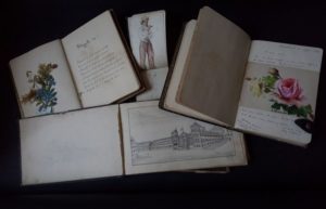 ALBUMS DE DESSINS Ensemble de cinq albums de dessins et aquarelles accompagnés de poèmes ; début XX° ; 2 au format. Certains anonymes d'autres signés (Marlène L'épée, U. Blum, Suzanne Girardot, M. Clement) représentant des fleurs, portraits, paysages, vue de Château Thierry, soldats... dessins de Guerini créateur de Toto. Reliures cuir et cartonnage. États moyens.