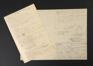 ARMEL-BEAUFILS Emile-Jean [Rennes, 26 novembre 1882], sculpteur français. Manuscrit autographe de deux pages avec des dessins de différents bateaux de pêche. Il décrit différents ports de Bretagne et l usage des navires. « St Malo une quinzaine de chalutiers à vapeur de 1000 ts, une dizaine de grands voiliers encore 3 mats goêlettes » « Granville armait jadis pour la grande pêche - Terre Neuve mais n'arme plus . Les types de bateaux étaient les mêmes qu'à Cancale.» On joint : ARMEL-BEAUFILS Emile-Jean [Rennes, 26 novembre 1882], sculpteur français. Lettre autographe signée avec un très joli dessin imprimé, d'un voilier échoué sur le sable. St Briac à Paris, 4 Juillet 1936. « cher ami, Entendu, avec plaisir nous irons vous voir Dimanche 26 vers 17 Heures (car j'ai séance de modèle avant) Au verso: « A Dinard on me demande d'ébaucher une plaque de bronze représentant le Jean IV à Dinard sous le prieuré ( ou il y a bonne tenue contre vent de S,SO et NO ) Je viens de lire Jean IV dans votre Bretagne ( je dis votre Bretagne ) il me semble que y être en très bonne odeur de sainteté vous m'en reparlerez...» On joint : ARMEL-BEAUFILS Emile-Jean [Rennes, 26 novembre 1882], sculpteur français. Ensemble de 7 cartes postales en noir et blanc, dont 5 représentants des statues et 2 des bateaux "Terre Neuvier" au départ de St Malo. Beaucoup sont des remerciements avec un petit mot plus personnel. « Tous nos remerciements et bonnes pensées pour la délicieuse soirée passée avec vous et vos amis, merci aussi avant que je m'en aille de votre nouvelle étude de la Cornouailles. Nous nous réjouissons beaucoup de cette lecture mais elle aura à lutter avec le souvenir que nous avons gardé de " face au couchant" et de vos admirables peintures brestoises. »