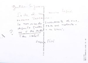 FINI Léonor [Buenos Aires, 1908 - Paris, 1996], artiste peintre surréaliste, décoratrice de théâtre et écrivaine, d'origine italienne. Carte autographe signée. 1 page in-12 oblongue au dos d'une carte postale, en italien. « Je sais que mon ami Lepri voyait Tallanco. Je ne me rappelle sincèrement pas d'avoir peint cette tête […] mais je dois le dire, (je ne comprends pas très bien). Je m'excuse. Salutation Leonor Fini. »