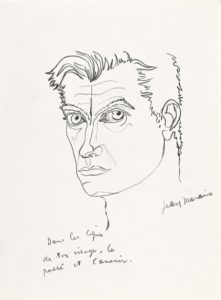 MARAIS Jean (Jean Villain-Marais, dit) [Cherbourg, 1913 - Cannes, 1998], acteur français. Dessin - Autoportrait de Jean Marais au crayon noir, signé. 1 page in-folio. En bas à gauche trois lignes de Cocteau : « Dans les lignes de ton visage, le passé et l'avenir ».