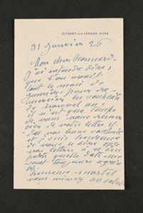 MONET Claude [Paris, 1840 - Giverny, 1926], peintre français. Lettre autographe signée, adressée à Bonnard. Giverny, 31 janvier 1926 ; 2 pages in-8° En-tête Giverny Par Vernon. Eure. Très belle lettre amicale pour souhaiter ses voeux au peintre Bonnard. « J'ai entendu dire que l'on avait tout le mois de janvier pour remercier les souhaits de nouvel an. Il n'est que temps de vous remercier de votre lettre et de vos bons souhaits et je suis heureux de vous dire que vos lettres à n'importe quelle date me sont toujours agréables. Heureux mortel vous vivez au soleil. Cela, c'est la vie. Ici nous venons de subir inondations, neige et glaces. C'est beau aussi, mais c'est dur pour les yeux âgés. Malgré cela ça va. Je persiste à vouloir m'en faire, mais sans doute je dois me tromper ».
