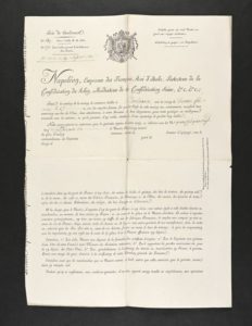 NAPOLÉON Ier (Napoléon Bonaparte) [Ajaccio, 1769 - Île de Sainte-Hélène, 1821], empereur des Français. Pièce signée, « NP », Palais de Saint-Cloud, 14 avril 1813 ; 2 pages grand in-folio en partie imprimées avec une vignette aux armes impériales et cachet sec (petite fente à l'intersection des 4 plis). Contresignée par le Ministre des Manufactures et du Commerce : Jean-Baptiste Henry Collin, comte de Sussy ; Ministre secrétaire d'État : Duc de Cadore ; ministre de la Marine et des Colonies : Duc Decrès et le Directeur général des Douanes François Ferrier. Passeport maritime accordé à un navire de la maison de commerce « Decaze fi ls-ainé & Cie de Bordeaux », appareillant du port de Bordeaux « à introduire dans un des ports de France, à son choix, des cotons, des huiles de poisson, des bois de teinture, du poisson salé et de la morue ; des cafés et sucres des Colonies françaises, de l'Amérique et de l'Asie ; des cacaos, des épiceries de toutes espèces d'îles ci-devant hollandaises ; des indigos, des bois d'acajou et d'ébénisterie ».