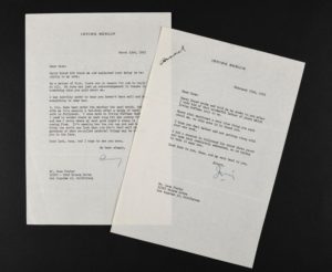 BERLIN IRVING [1888 - 1989], compositeur et parolier américain d'origine russe. Ensemble de 2 lettres dactylographiées, signées, adressées à Gene Fowler. Datées du 15 février 1955 et 23 mars 1955. Il y mentionne son travail à Hollywood. « I did a stretch in Hollywood for about three years and came back completely exhausted, so am trying to take it easy now. » ; « Harry Brand did thank me and explained your delay in replying to my note. [...] I, too, have been under the weather the past month, but with me it's usually a let-down after a seige of hard work in Hollywood. I once said to Irving Hoffman that I used to wonder where my next song hit was coming from and I worry where my next good night's sleep is coming from. It's amazing how low you can get and how black the world can look when you don't feel weel regardless of what so-called material things may be staring you in the face ».