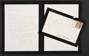 DEBUSSY Claude [Saint-Germain-en-Laye, 1862 - Paris, 1918], compositeur français. Lettre autographe signée, adressée à Alfred Cortot. 16 octobre 1915 ; 1 page in-8°, sur papier de deuil, enveloppe jointe. « Excusez mon retard à répondre à votre aimable lettre.... J'ai vécu trois mois en sauvage et suis à peine revenu à Paris. Vous ne pouvez douter de ma sympathie pour la Fraternelle! seulement voici deux ans que je n'ai dirigé un orchestre. N'ayant jamais brillé dans cet emploi, j'y serais - convenez-enencore plus maladroit. D'autre part, j'ai pris la résolution de ne plus jouer en public, jugeant inutile de ne montrer que... des « indications ». Tout ceci, qui est une mauvaise réponse, est vrai. La guerre m'a fortement touché. Ceux-que-l'on-ne-nomme-pas nous ont fait trop de mal, y compris la musique. Encore mes regrets. » Référencé dans la correspondance de Claude Debussy, édition Gallimard, page 1951.