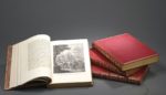 CERVANTES SAAVEDRA, Miguel de - El Ingenioso Hidalgo Don Quixote de la Mancha. Nueva Edicion corrigida por la Real Academia Española. Madrid, Joaquin Ibarra, 1780. 4 vol. in-4, 4 front., portrait, 31 pl. h. t., 2 cartes dépl., 2 cartes supplémentaires non signalées, plusieurs suites ajoutées, traces d'humidité subsistantes malgré un lavage, qqs. empreintes laissées par des onglets, pl. maroquin rouge dans le style du XVIIIe siècle, triple fil. dor. sur les plats, dos à nerfs orné, dent. int., tr. dor. (CHAMPS). COHEN 218. UPDIKE II, 73. PMM (Fine Printing) 123. 31 fig. grav. par Ballester, Barcelon, Fabregat, Gil, Mol, Muntaner, Salvador y Carmona, Selma, d'après Barranco, Brunette, Del Castillo, Ferro, Gil. Edition considérée comme une des plus belles jamais réalisées du Don Quichotte. Elle fut conçue par l'Académie Royale de Madrid tant sur le plan esthétique que pour la correction du texte. Une fonte spéciale de caractères fut créée par Geronimo Gil fondeur de l'imprimerie de la Biblioteca Real. Un papier de lin fut fabriqué dans les moulins de Joseph Florens en Catalogne. Ex. enrichi de trois suites : 31 gravures de Fokke, Picard, V. Schley et Tanjé d'après principalement Coypel. La Haye, 1746, in-4 - 28 gravures de Neist d'après Hayman. Londres, 1755, in-8 - 32 gravures de P. Duflos, Moreno Texada d'après Camaron, Monnet, Porret, Navarro, R. Ximeno. Madrid, 1797-1798, in-8. Provenance : Collection du Marquis Alphonse d'Aoust (1819-1909) ; Par descendance à l'actuel propriétaire.