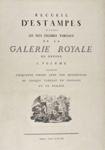 GALERIE ROYALE DE DRESDE] - Recueil d'estampes d'après les plus célèbres tableaux de la Galerie Royale de Dresde. Dresde, 1753-1757. 2 tomes en un vol. in-plano, (2) ff., XXVII pp., (2) ff. (plan de la galerie), (2) ff. (portraits), 43 pl. dont 3 sur double page ; XXXIII (1) pp., 48 pl. dont 2 sur double page ; manquent 9 pl. /100, une déchirée sans manque, trois arrachées, pl. maroquin bleu nuit du XIXe s., dent. et fil. dor. sur les plats, dos à nerfs orné, tr. dor., qqs. épid. COHEN 423. THIEME-BECKER XVIII, 189. Portraits d'Auguste III électeur de Saxe et roi de Pologne, et de sa femme Marie-Josèphe archiduchesse d'Autriche (2 pl.), plan de la galerie (2 pl.) Quatre-vingt-onze planches : tableaux du Corrège, Le Parmesan, Nicolo dell'Abbate, Andrea del Sarto, J. Romain, Titien, Véronèse, Procacchini, Carrache, Reni, Vanini, Feti, Ribera, Preti, Giordano, C. Dolci, Maratti, Cignani, Langetti, Rubens, Bellini, Dosso, Tintoret, Salviati, Basan, Turco, Ricci, Francia, Albane, Le Guerchin, Lanfranc, Tiarini, Cantarini, Scarsellino, Castiglione, Biscaïno, Vaccaro, Solimène, Pagani, Holbein, Rembrandt, Van Dyck, Berghem. En raison de sa connaissance de l'art, Karl Heinrich Heineken fut chargé par l'électeur de Saxe de faire d'importantes acquisitions et de réorganiser ses collections jusqu'à ce qu'il le nomme finalement directeur de la galerie. En 1748, Heineken fit appel à huit dessinateurs et quarante graveurs pour pérenniser une collection qui subsiste encore après bien des pérégrinations. Provenance : Collection du Marquis Alphonse d'Aoust (1819-1909) ; Par descendance à l'actuel propriétaire.