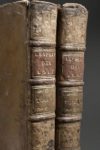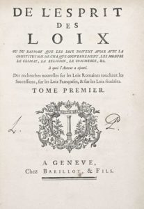 MONTESQUIEU, Charles de Secondat de la Brède - De l'Esprit des Loix. Ou du rapport que les loix doivent avoir avec la constitution de chaque gouvernement, les moeurs, le climat, la religion, le commerce, etc. Genève, Barillot et fils, (Paris, Durand, 1748 ou janvier 1749). 2 vol. in-4, (4) ff., XXIV pp., 522 pp., (1) ff. (Errata) ; (2) ff., XVI pp., 564 pp., papier un peu jauni, qqs. rouss., veau fauve de l'ép., dos à nerfs orné, coiffes et coins us., charn. en partie fend., pet. taches sur les plats et au dos. TCH IV, 930. Seconde édition, imprimée à Paris immédiatement après l'édition originale de Genève ; on remarque que le nom de l'éditeur est fautivement imprimé avec un seul r. Premier des trois tirages de cette édition comportant bien le f. d'Errata, (35 corrections) absent dans les deux suivants.