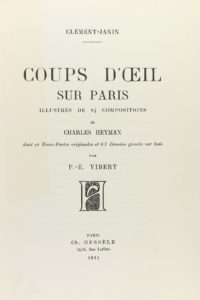.1911.. LIBRO: .(ARTE).. .HEYMAN, CHARLES; CLÉMENT-JANIN:. .COUPS D´OEIL SUR PARIS. Ilustrés de 84 compositions de.... Paris: Ch. Hessèle, 1911. 4º mayor. Bellamente ilustrado en el texto y 20 aguafuertes en y fuera de texto. Enc. en rústica...