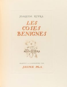 .1935.. LIBRO: .(BIBLIOFILIA).. .RUYRA, JOAQUIM:. .LES COSES BENIGNES.. Barcelona: Rosa Vera, 1935. 4º menor. 91 p. + 1 h. Ilustr. con aguafuertes de Jaume Pla. Edición numerada a mano de 150 ejemplares en papel de hilo con firma del artista. En...