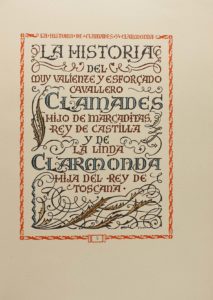 .1944.. LIBRO: .(BIBLIOFILIA).. .LA HISTORIA DEL MUY VALIENTE Y ESFORZADO CAVALLERO CLAMADES HIJO DE MARCADITAS, REY DE CASTILLA Y DE LA LINDA CLARMONDA, HIJA DEL REY DE TOSCANA.. Barcelona: Ed. Mon Floris, 1944. Folio. 93 p. + 2 h. Texto en orla....