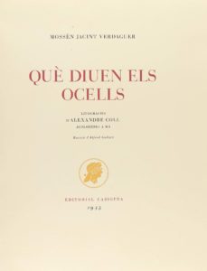 .1945.. LIBRO: .(BIBLIOFILIA).. .VERDAGUER, JACINT:. .QUÈ DIUEN ELS OCELLS.. Litografies d´Alexandre Coll acolorides a mà. Revisió d´Alfred Gallart. Barcelona: Editorial Casiopea, 1945. Folio. III + 162 p. + 2 h. + 16 litografías en color,...