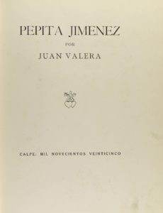 .1925.. LIBRO: .(BIBLIOFILIA).. .VALERA, JUAN:. .PEPITA JIMÉNEZ.. Madrid: Tall. Calpe, 1925. 4º mayor. 269 p. Ilustr con lám. sobrepuestas, fuera del texto. Enc. plena piel edit. con hierros dorados en ambos planos, lomera cuajada, corte superior...