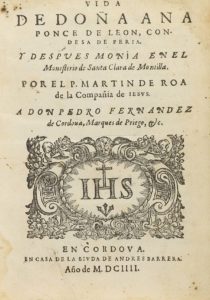 .1604.. LIBRO: .(BIOGRAFÍA- HISTORIA).. .ROA, MARTIN DE:. .VIDA DE DOÑA ANA PONCE DE LEON, ONDESA DE FERIA. Y DESPUES MONJA EN EL MONASTERIO DE SANTA CLARA DE MONTILLA.. Cordova: casa de la Biuda (sic.) de Andres Barrera, 1604. 8º. 6 h. + 240 p....