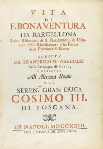 .1723.. LIBRO: .(HISTORIA-BIOGRAFÍA).. .GALLUZZI, FRANCESCO Mª.:. .VITA DI F. BONAVENTURA DA BARCELLONA LAICO RIFORMATO DI S. FRANCESCO, & INSTITUTORE DELLA RICOLLEZIONE, O SIA RITIRO DELLA PROVINCIA DI ROMA.. Napoli: con licenza de superiori,...