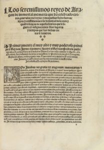 colofón + 2 h. de tablas. Tres partes a dos columnas en tipografía gótica. Marca tipográfica xilografiada en colofón. Falta la portada y las dos hojas indicadas al principio. Ejemplar con numerosas anotaciones marginales de algún jurista de la época. Ha sido bien restaurado, con h. b. donde falta la original, consolidada alguna falta, se han preservado todos los márgenes. Enc. en pergamino reciente, con escudos de Aragón dorados en los planos, lomera rotulada. Palau 95560. CCPB 30847-1.