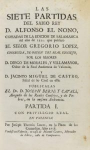 .1758.. LIBRO: .(DERECHO).. .ALFONSO X; LOPEZ, GREGORIO:. .LAS SIETE PARTIDAS DEL SABIO REY D. ALFONSO EL NONO, COPIADAS DE LA EDICION DE SALAMANCA DEL AÑO DE 1555, QUE PUBLICÓ EL SEÑOR.... Valencia: Joseph Thomàs Lucas, 1758. 6 vol. en 8º. I:...