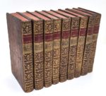 I: VIII + 400 p. II: 401 p. III: 424 p. IV: 396 p. V: 400 p. VI: 411 p. + 2 h. VII: VI + 415 p. VIII: IV + 392 p. IX: IV + 352 p. Nueve vol. enc. en pasta española, doble tejuelo, lomeras cuajadas, cortes pintados, algún plano ligeramente rozado.