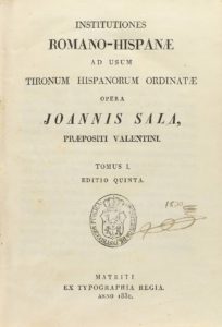 .1830.. LIBRO: .(DERECHO).. .SALA, JOANNIS:. .INSTITUTIONES ROMANO-HISPANAE AD USUM TIRORUM HISPANORUM ORDINATAE.. Matriti: Ex Typ. Regia, 1830. 2 vol. en 8º mayor. I: 2 h. + 525 p. + 1 h. II: 2 h. + 512 p. Texto a dos columnas. Dos vol. enc. en...