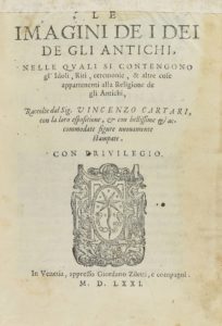 8º mayor. 18 h.+ 566. Profus. ilustr. con más de 80 grabados en el texto. Capitales y cabeceras xilografiadas. Ligera señal de óxido. Magen superior de la portada restaurado. Enc. en pasta española, tejuelo. Aunque el texto se había publicado por primera vez en 1556, estamos ante la primera edición ricamente ilustrada de esta historia de los dioses de la antigüedad.
